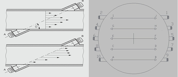 傳感器安裝示意圖(時(shí)差法)(當選用多普勒傳感器時(shí),每組傳感器安裝在管道同一切面上)
